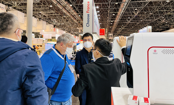 在yabo鸭脖官网展台,“全自动解决方案”“半自动解决方案”“新冠整体解决方案”,以最大程度满足不同国家和地区客户、不同应用场景检测需求的特点,获得了众多来访国际客户的好评。尤其是iPonatic四通道产品,以其便捷、易操作、检测时间快、检测项目多等优势吸引了会场一大波新老“粉丝”的目光。