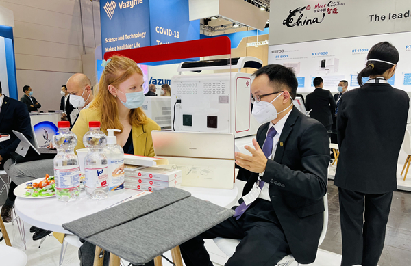 在经过同行推荐并使用了yabo鸭脖官网产品后,一位从事检测工作十多年的苏丹客户专门找到yabo鸭脖官网展台,进一步了解yabo鸭脖官网新冠和其他试剂检测业务。看完yabo鸭脖官网方案的操作后,他频频点头并表示,“你们的方案应用场景广、操作简便、精准可及,我非常看好你们!”